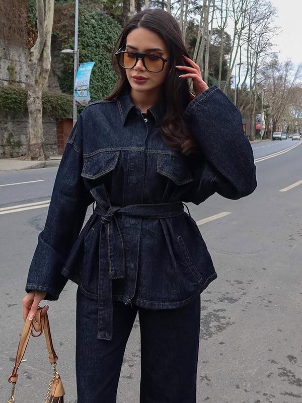 Elevate your style with this dynamic belted denim pants set, perfect for the Spring/Summer 2025 season. This solid-patterned ensemble features a sportive design with a chic turn-down collar and long sleeves, expertly crafted from high-quality denim material. The set offers a seamless blend of comfort and trendiness, making it an ideal choice for those seeking a versatile and fashionable addition to their wardrobe.
