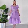 2024 Summer Women's Square Neck Puff Sleeve Polka Dot Cinched Waist Long Dress