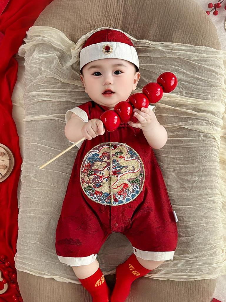 Crafted from soft viscose fabric, this charming romper is designed for boys celebrating their first birthday in style. Its sleeveless design ensures comfort during warm summer events, while the harem-style cut allows for easy movement, perfect for crawling and play. This festive outfit features traditional Chinese elements, making it an ideal choice for a special banquet or celebration.