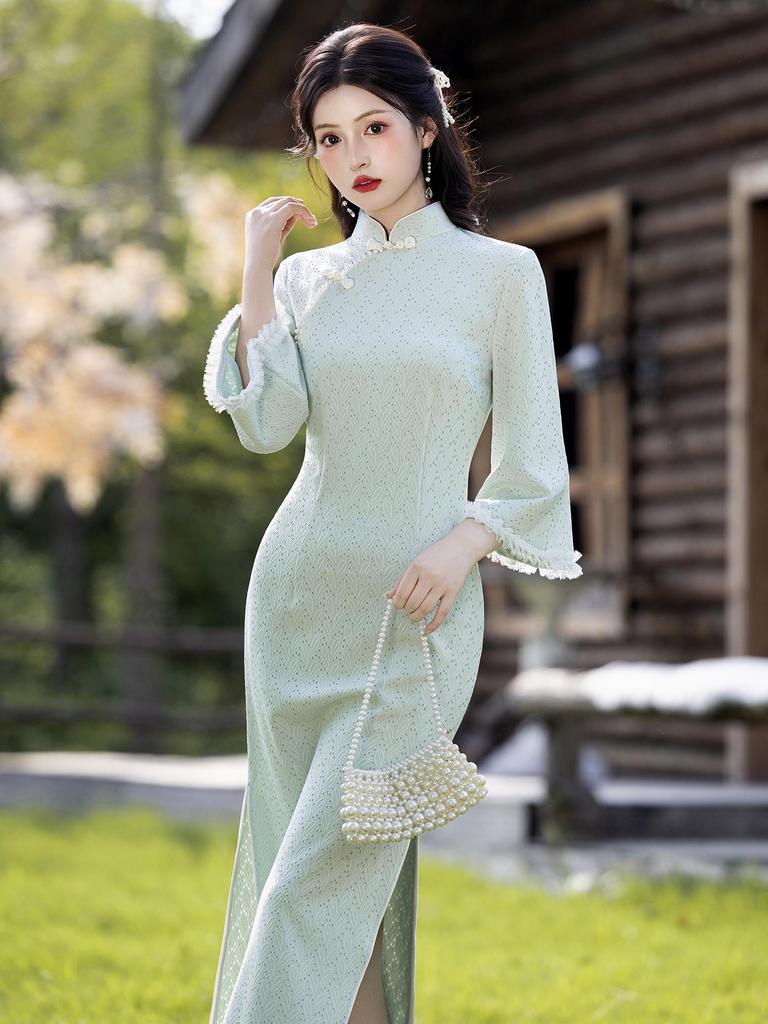 Experience timeless elegance with this exquisite long-sleeve qipao, crafted to enhance your autumn wardrobe. The captivating water green color brings a serene and sophisticated touch to this traditional Chinese dress. Designed for comfort and style, it gracefully drapes over the body, highlighting a graceful silhouette. This piece is perfect for formal occasions or as a statement piece in any fashionable ensemble.