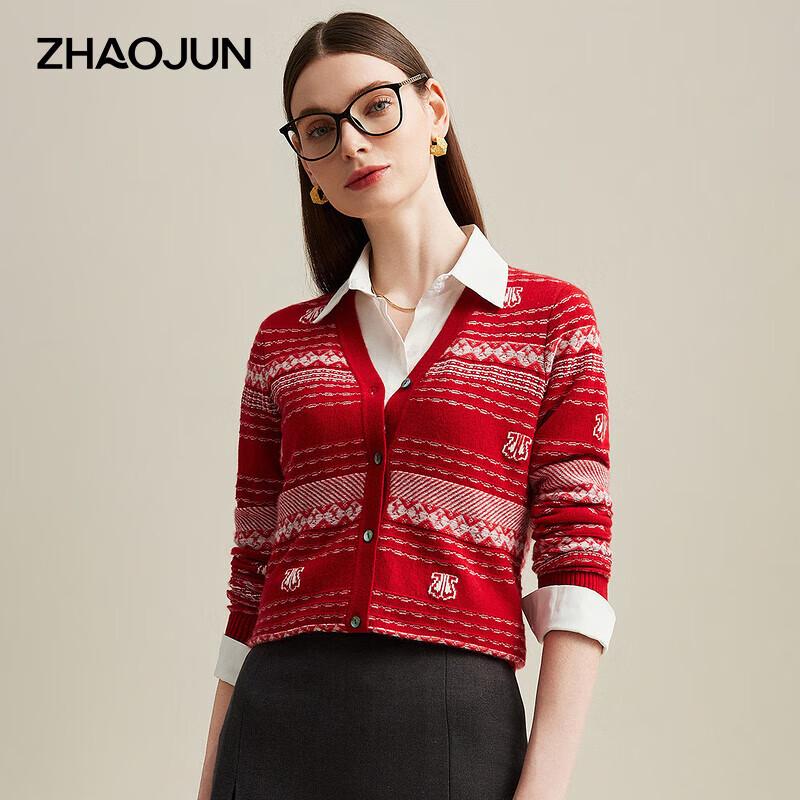 Zhaojun Women's Pure Cashmere V-Neck Striped Cardigan