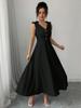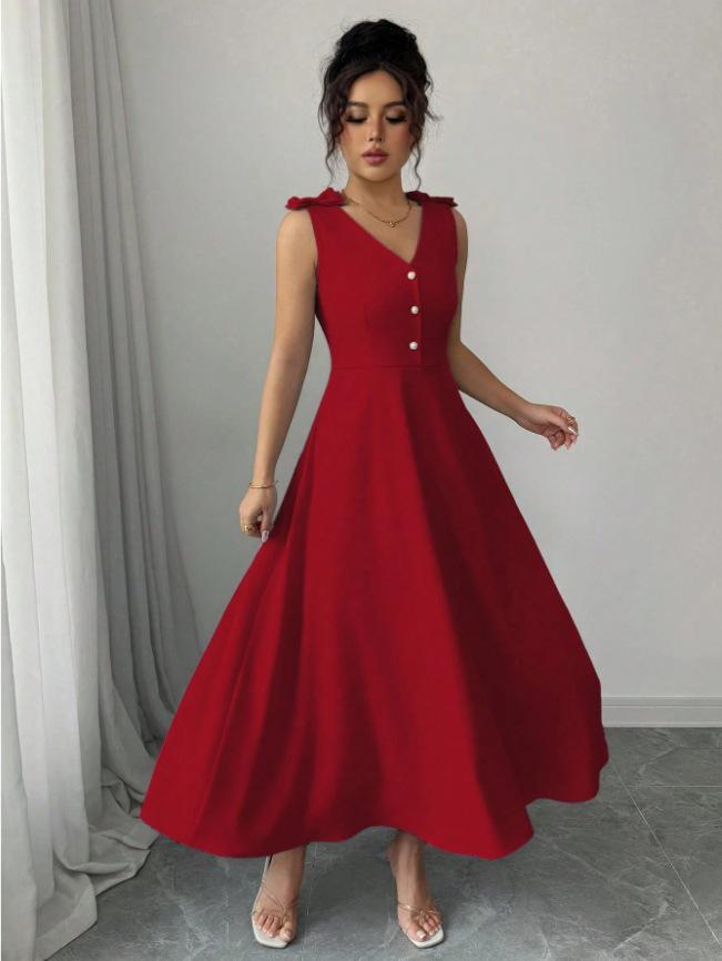2025 Spring/Summer Blue Sleeveless Midi Dress with Bow and Button Waist