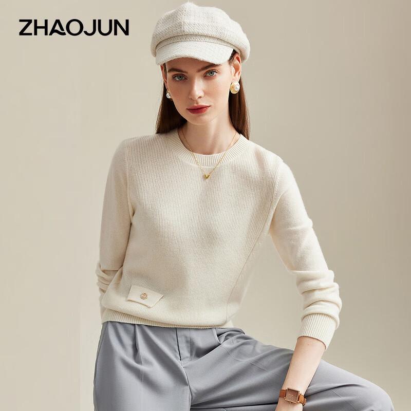 Zhaojun Women's Cashmere Round Neck Long Sleeve Pullover Sweater with Pockets