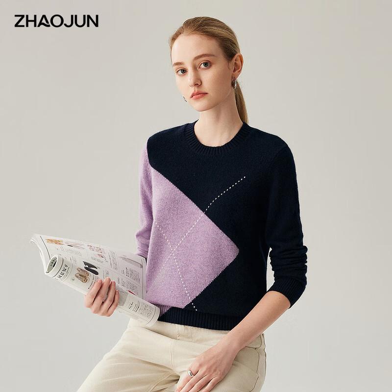 Zhaojun Women's 100% Cashmere Round Neck Color Block Knit Sweater