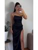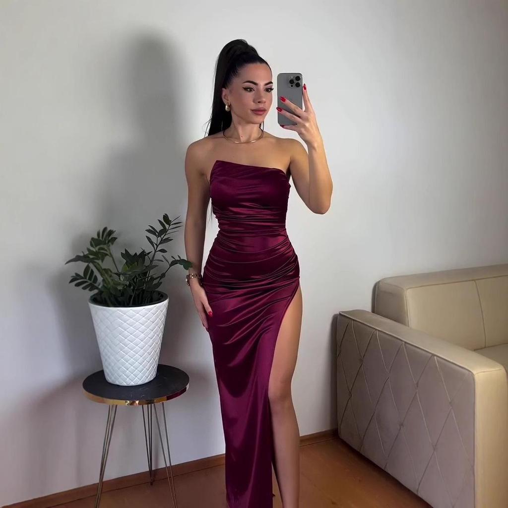 This stunning strapless dress from the Summer 2025 Collection is crafted from a luxurious polyester-spandex blend, ensuring a comfortable yet form-fitting silhouette. Designed to accentuate your figure, it features a waist-cinching design and a daring high slit, making it the perfect choice for any elegant occasion. The dress's satin finish adds a touch of sophistication, while its modern design guarantees you'll stand out in any crowd. Ideal for warm-weather events, this dress effortlessly combines style and comfort.