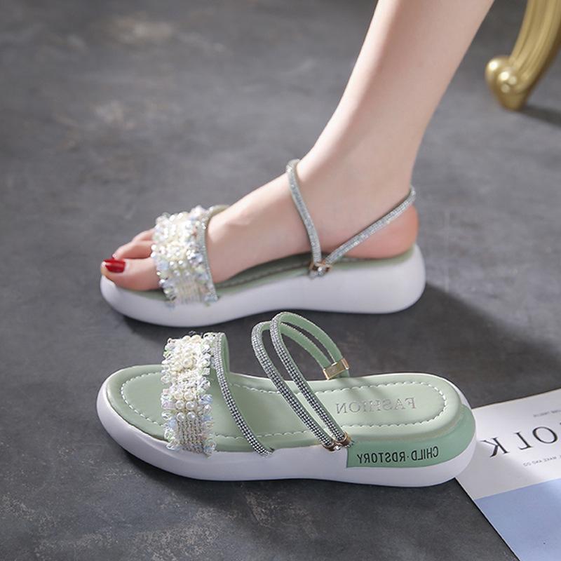 Pregnant Women Wear Sandals and Women's Flat-bottomed Rhinestones In Summer, One Word with Cool Slippers and One Pedal, and Wear Soft-soled Korean Ver