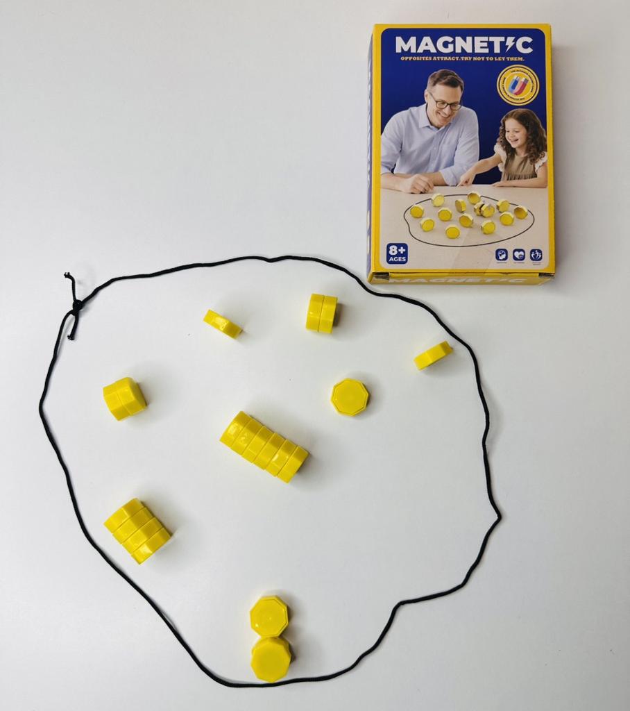 Game with magnetic stones. Game Rules - place all magnets in the concave circle so that the magnets do not connect with each other. Suitable for travel, camping, family celebrations, and various leisure and entertainment. Actively develops strategic and logical thinking, accuracy, and concentration. Suitable for both children and adults. The set includes 10 magnets and a cord for the circumference. Arrived in a branded cardboard box and in a pouch. I recommend to buy.
