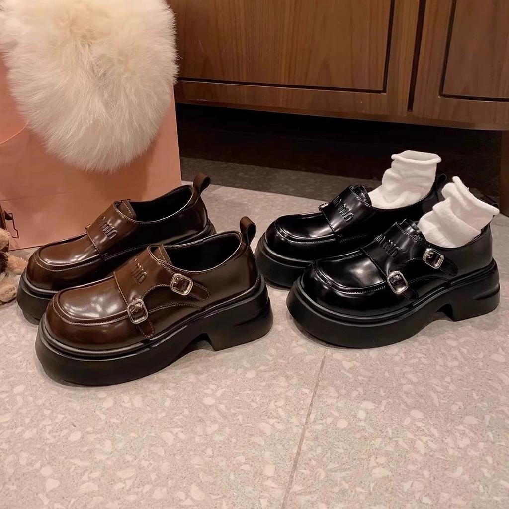 Cowhide Version~ Grape Mother Same Style, Amiu Double Buckle with Loafers Round Head British Style Platform Small Leather Shoes Single Shoes Women