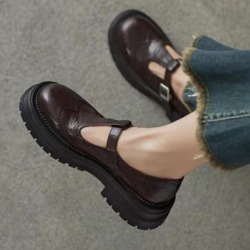 Fashion Retro Women's Brogue Leather Shoes Spring Round Head Carved Mary Jane Shoes Women Oxfords Women's Shoes Ladies Leather Female