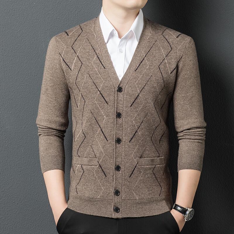Yiliteng Men's V-Neck Pure Wool Cardigan Sweater