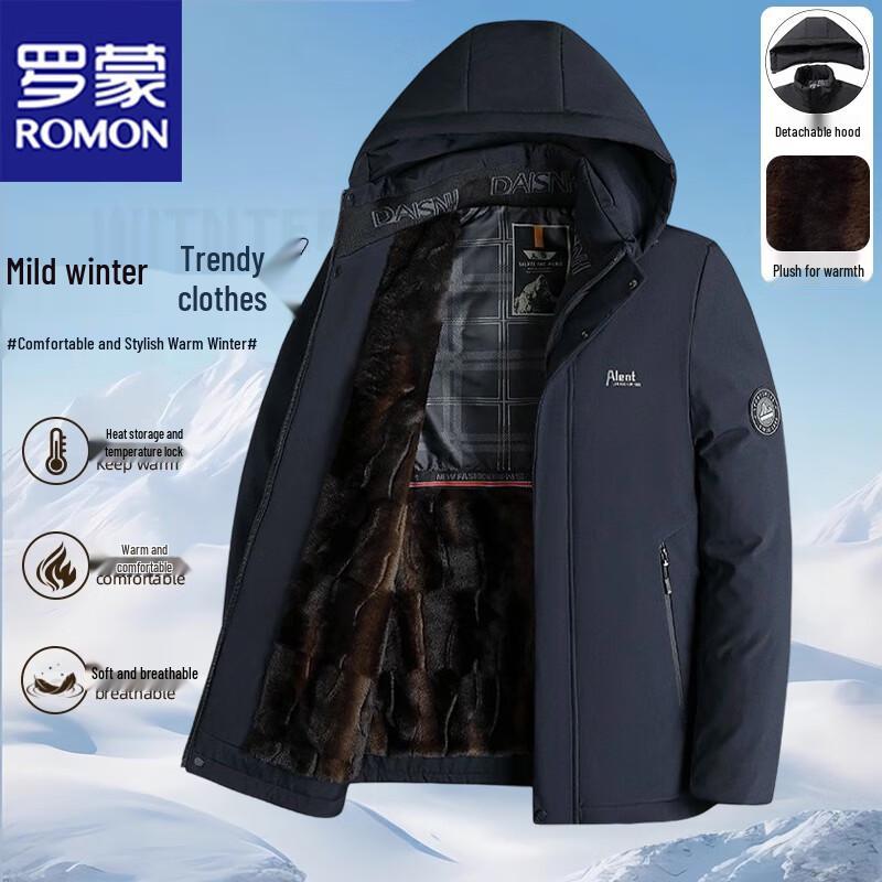 ROMON Men's Winter Fleece-Lined Padded Jacket with Detachable Hood