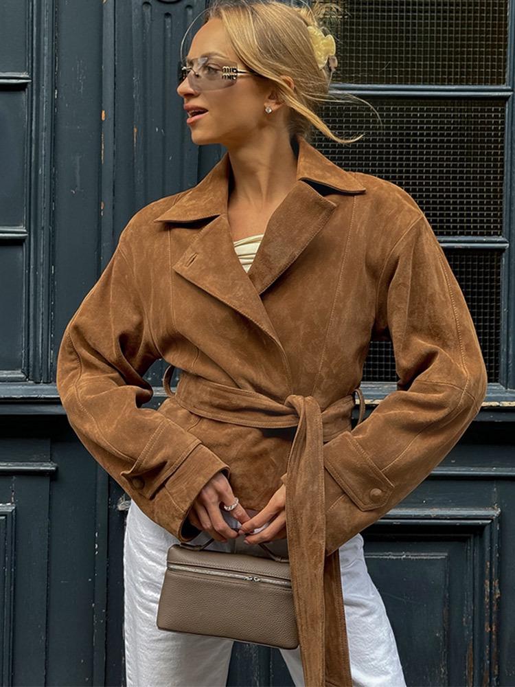 European and American Retro Autumn Suede Tie-Waist Coat with Turn-Down Collar