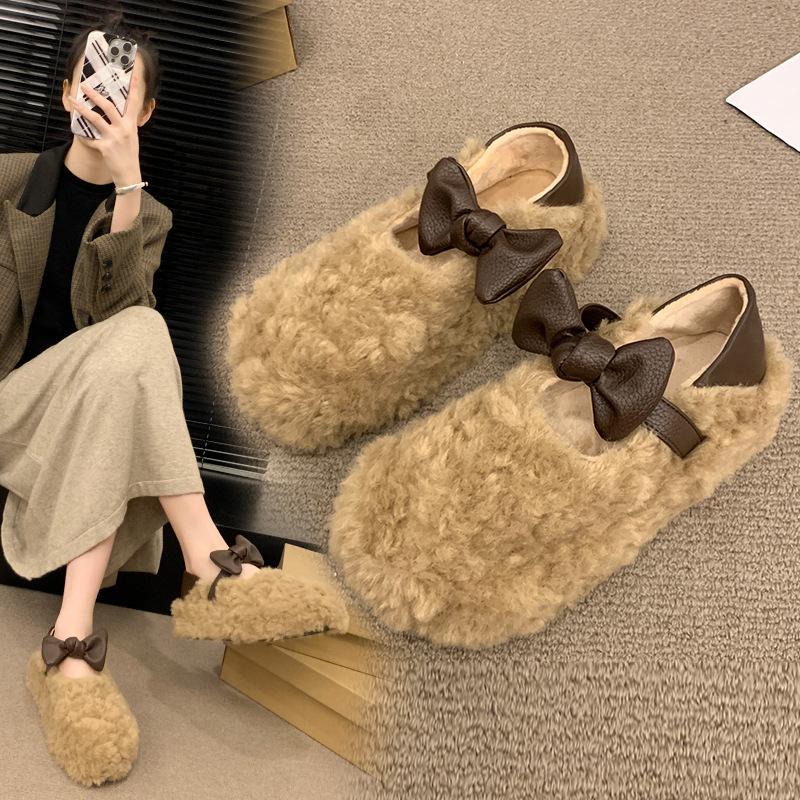 Plush Women's Shoes Are Comfortable and Versatile for Daily Wear, Simple and Classic Solid Color, Low Heel Soft Sole, One Pedal Cotton Shoes for Women