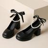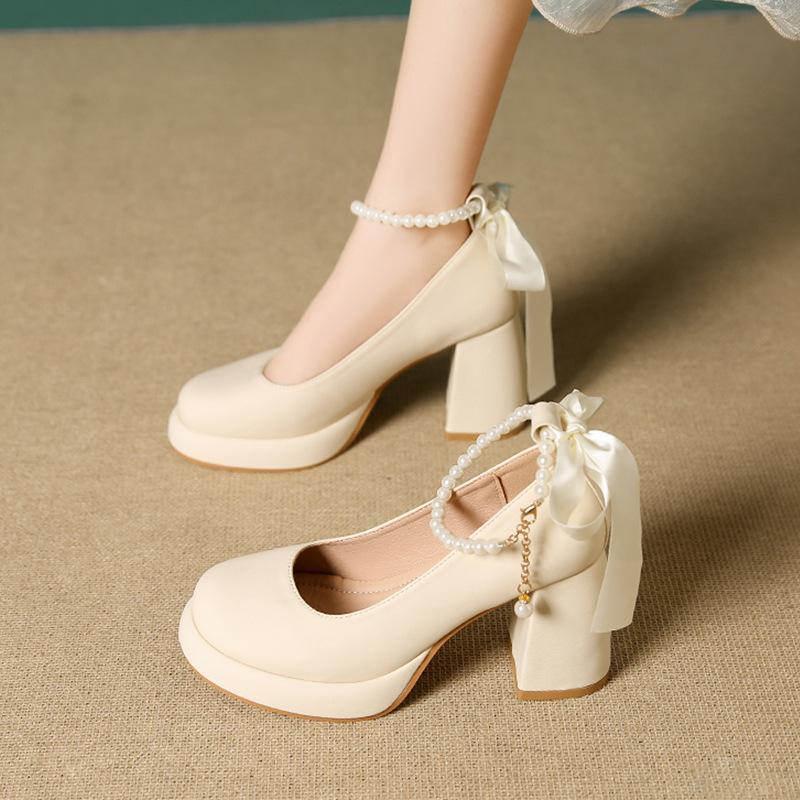 Soft Leather High Heels Women's Spring New Pearl French Thick Heel White Mary Jane Gentle Wind Light Mouth Single Shoes Women