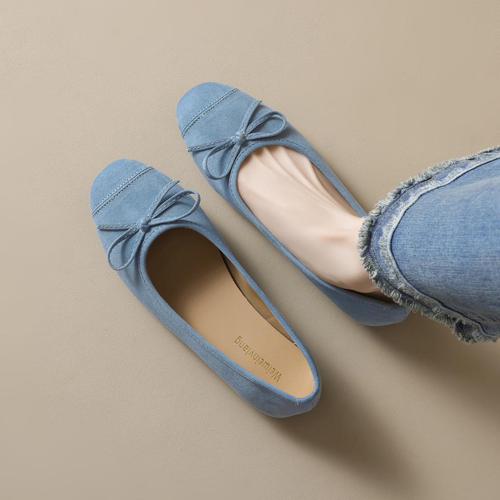 Weiwei Girl 313-22 French Flat-soled Single Shoes Women's Bow Ballet Shallow Mouth Soft Sole Suede Beanie Shoes Women
