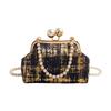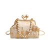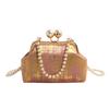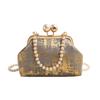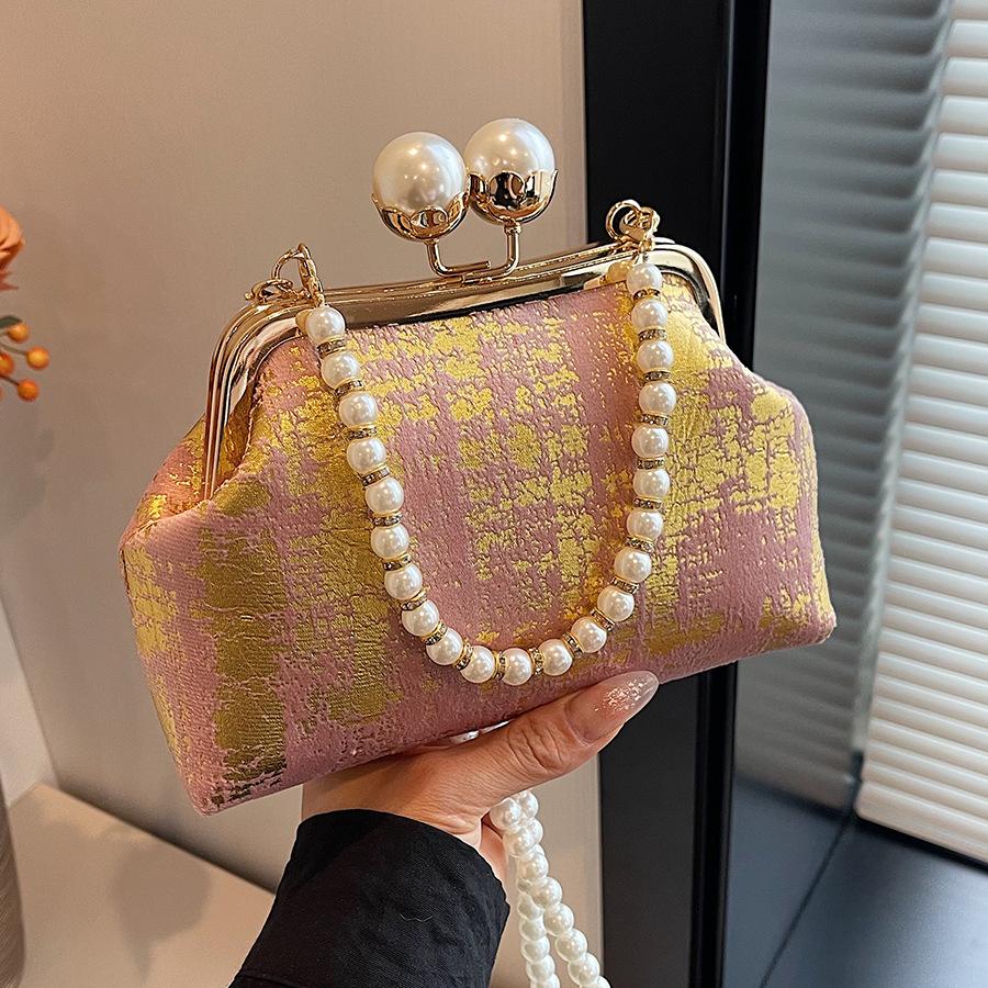 - **Structured Design Details**: Features a stylish clutch bag silhouette with PU material, textured metallic pattern, and elegant pearl chain & clasp accents. It supports versatile carrying options (handheld, shoulder, crossbody). It exudes vintage and glamorous charm. Four sophisticated color options cater to diverse style preferences.