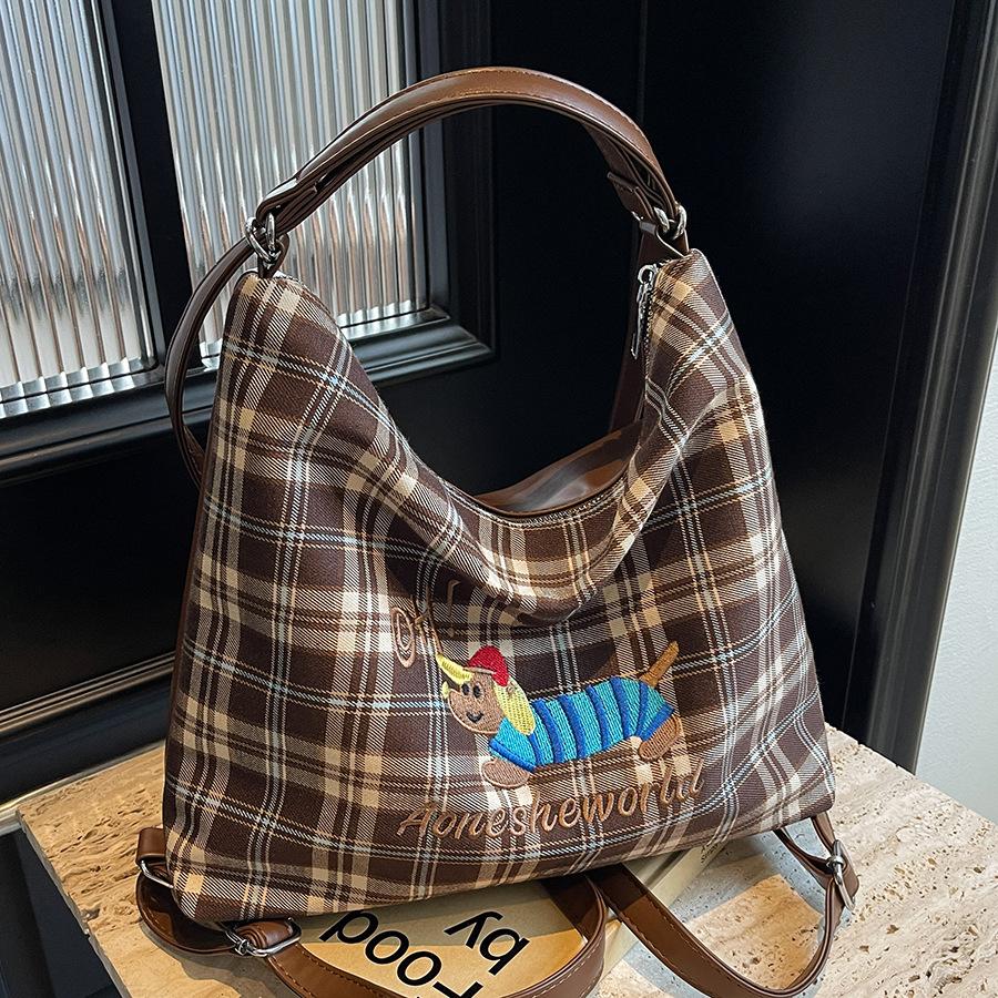 - **Structured Design Details**: Features a stylish hobo bag silhouette with PU material, plaid pattern, cute embroidered motifs (like animals or bows), and versatile carrying straps. It supports multiple carrying options (handheld, shoulder, backpack) with an adjustable 110cm strap. It exudes preppy and playful charm. Four unique pattern options cater to diverse style preferences.