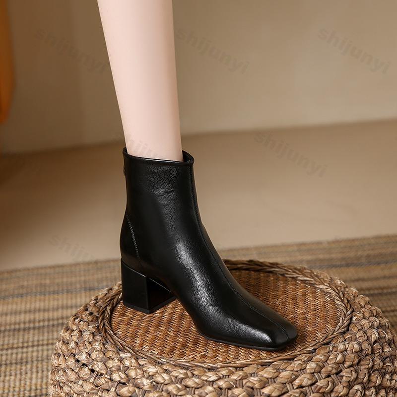 Fashion Women's Leather Boots 2025 Autumn New Dress Women Short Boots Fashion Mid-Heel Women's Ankle Boots High Heels Zapatos De Mujer
