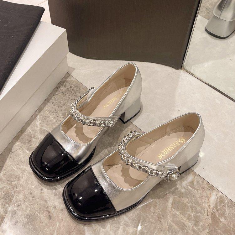 One-word Silver Single Shoes Women's 2025 New Summer New High-heeled Flat-bottomed French Mary Jane Single Shoes Women's Small Leather Shoes