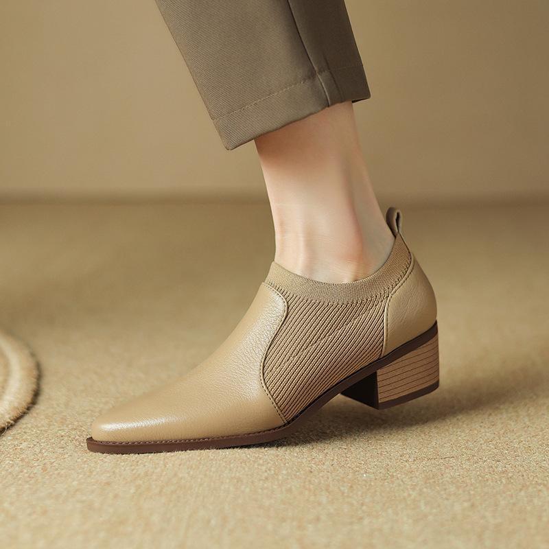 Thick Heel Single Shoes Women's 2025 Spring and Autumn New French Retro Pointed Deep Mouth Medium Heel Small Leather Shoes One Pedal Loafers