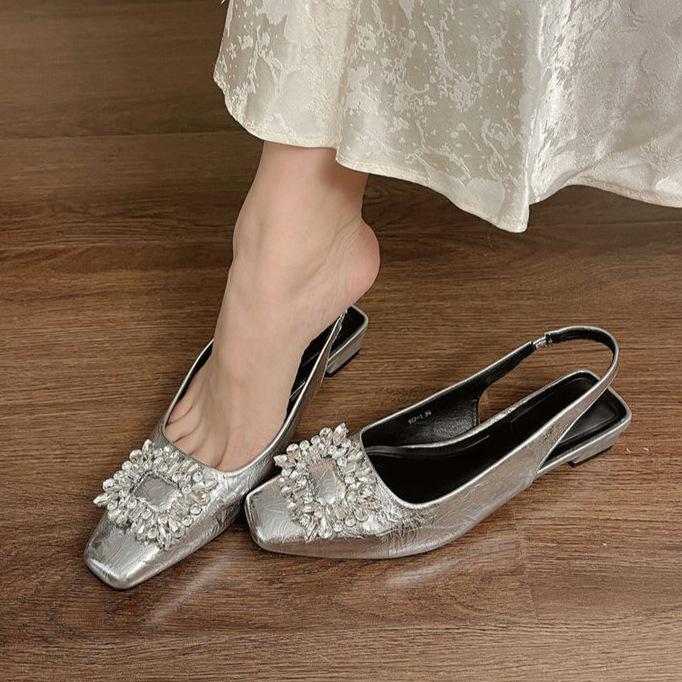 Fairy Feng Shui Diamond Baotou Summer 2025 New Square Head Back Empty Pedal New Chinese Mary Jane Middle Heel Sandals