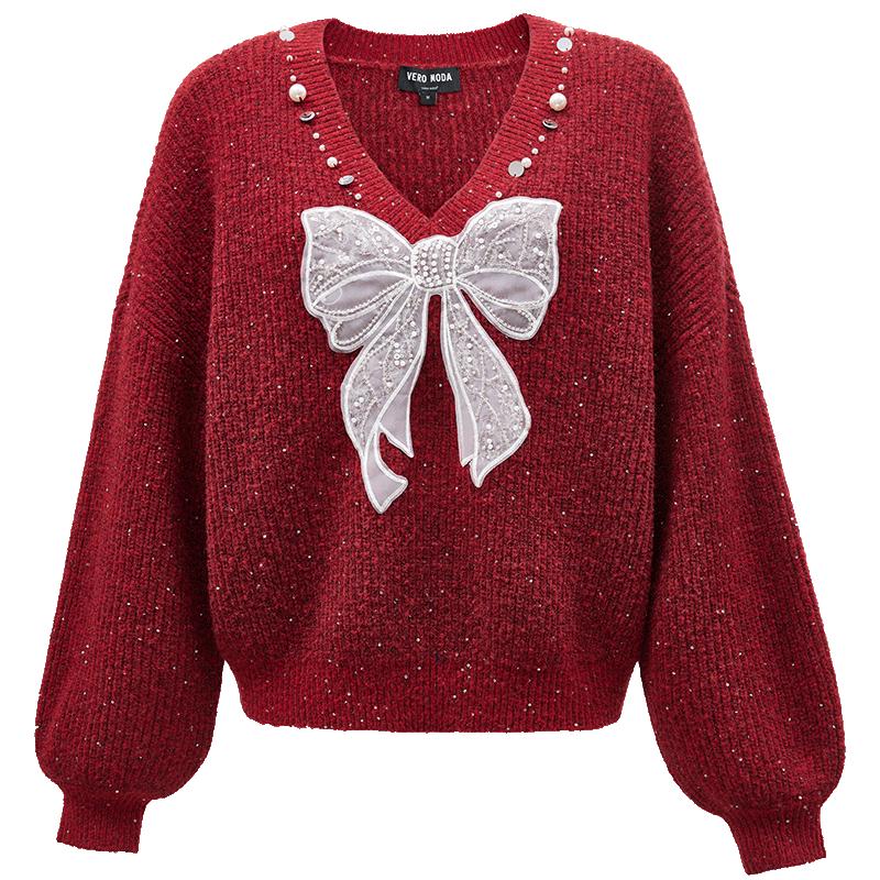 Veromoda Women's Loose Fit V-Neck Wool Blend Knit Sweater with Bow-Knot & Sequins