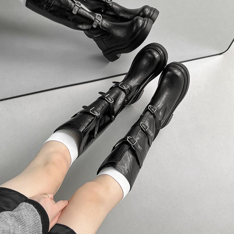 Retro Round Head Belt Buckle Slim Tall Knight Boots 2025 Autumn and Winter New Thick-soled Thick-heeled Boots Women's Martin Boots
