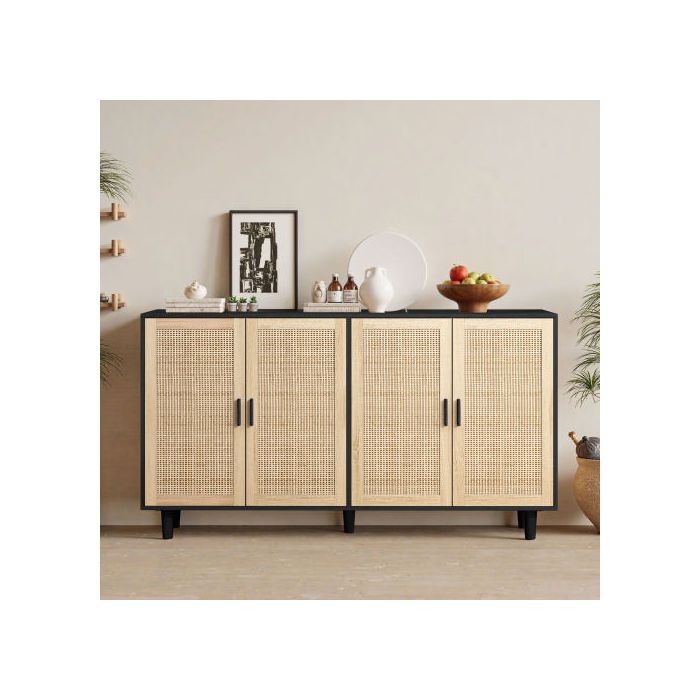 Meuble de rangement - MUVOE - 4 portes - Noir - Rotin - Étagère réglable