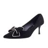 Stiletto High Heels Women's Spring New Rhinestone Bow Pointed Single Shoes Black Soft-soled Leather Shoes
