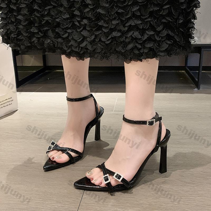 Fashion Party Women Shoes 2025 Summer Fashion Square Buckle Rhinestone Sandals Pointed Toe Thin Heels Ankle Super-high Heel Pumps