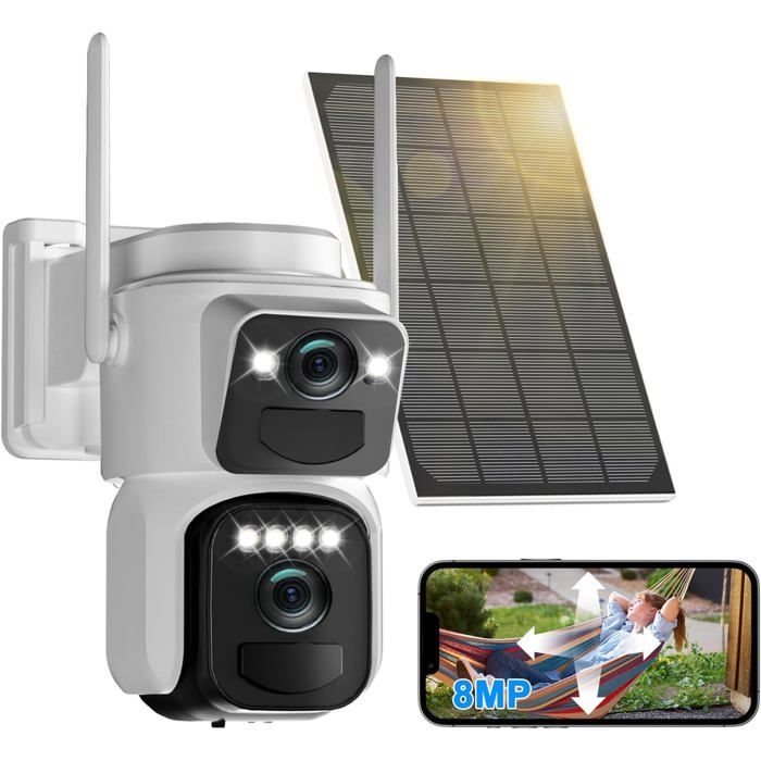 Caméra de Surveillance Extérieure Abiso 8MP WiFi, Double Objectif, Suivi Auto, Audio Bidirectionnel, Détection AI, Solaire, 360°…