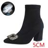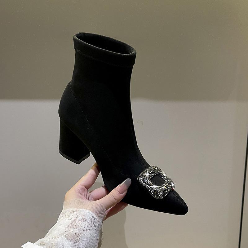 French Thick Heel High Heel Short Boots Women's Autumn and Winter Rhinestone Square Buckle Elastic Thin Boots Light Luxury Temperament Pointed and a