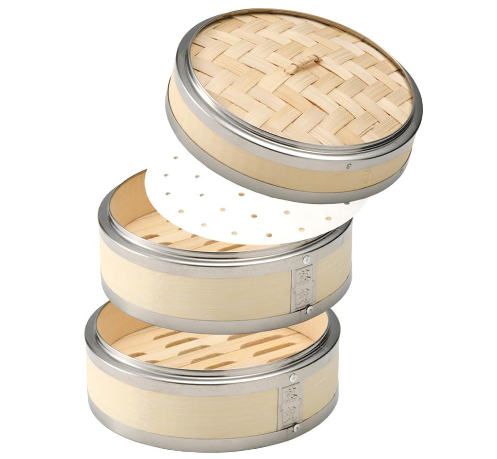 Heist Cantonese-Style Bamboo Steamer, 2 Boilers and 1 Lid, Stainless Steel Rim, Commercial Use, FH87027-21 (Cantonese-Style 21cm)