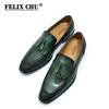 FELIX CHU Men's Genuine Leather Handmade Loafers Green/Black Tassel Dress Shoes Autumn Wedding Moccasin Party Footwear