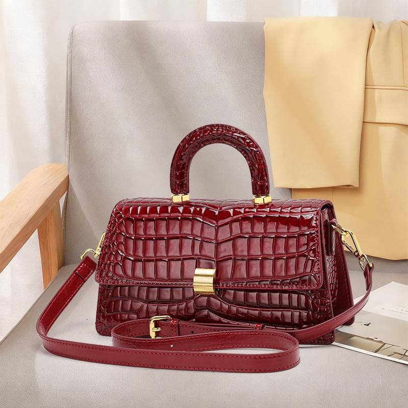 Elevate your look with this elegant women's handbag crafted from genuine top-grain leather. Rich wine red color, glossy crocodile-embossed texture, and a chic metal clasp create a bold, sophisticated statement — perfect for adding glamour to your daily style or evening elegance.