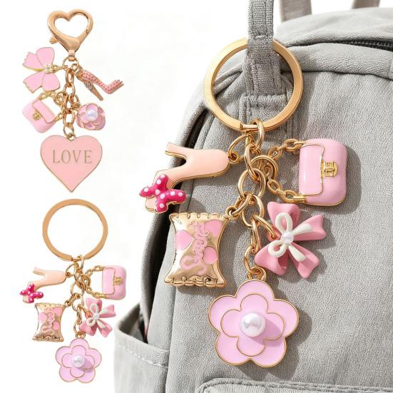 Diverse Pendant Combinations: Each keychain features an array of charming small pendants, including pink high heels, mini handbags, faux pearl flowers, bows, and heart-shaped plaques inscribed with "LOVE." This intricate detailing adds depth and character to the accessory, making it a standout piece.
