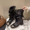 Square Head Strap Bow Pleated Fashion Boots Retro Big Tube Circumference Thick Heel Short Boots Punk Style Pile Medium Tube Boots Women