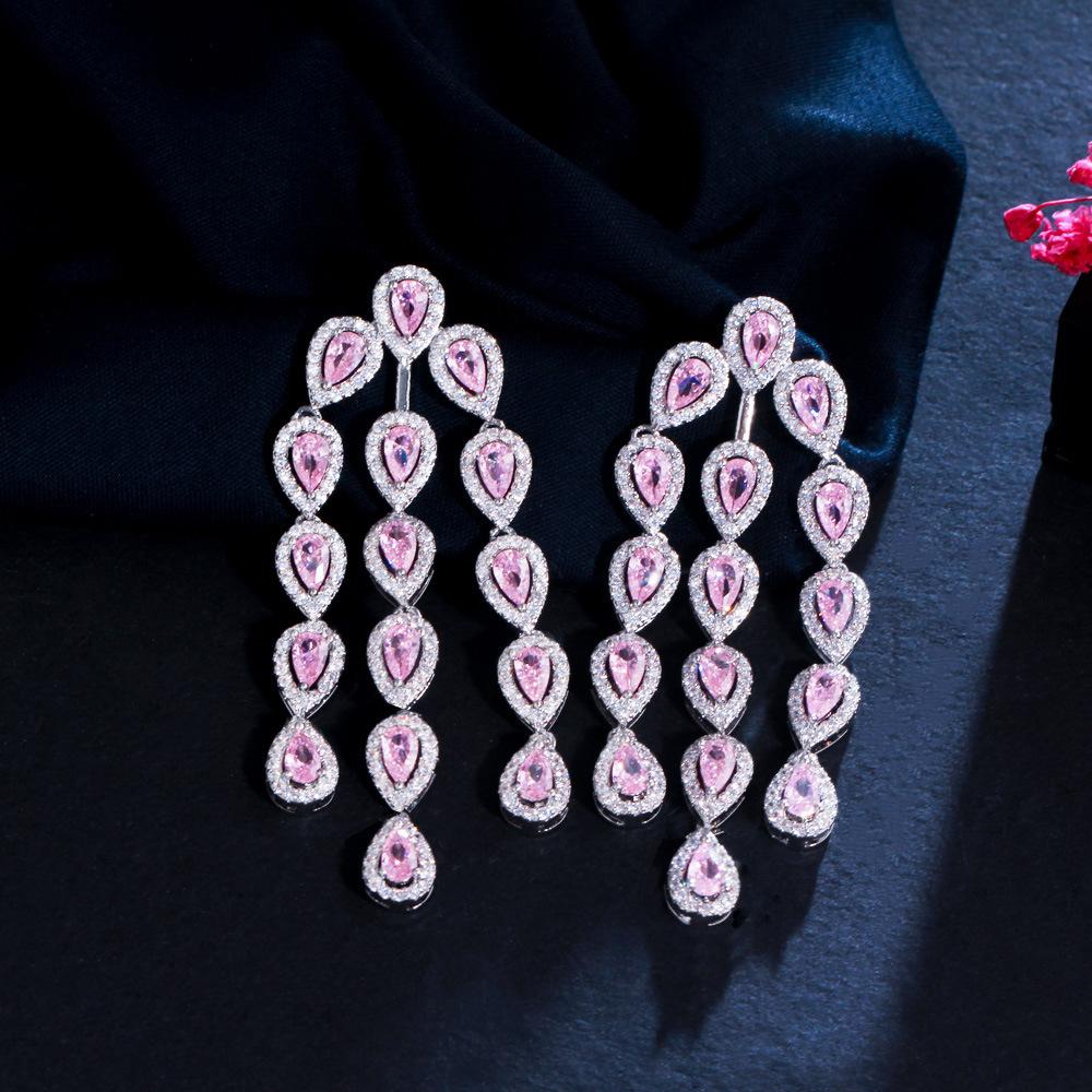 Needle Temperament Earrings Heavy Industry Micro-Inlaid Zircon Pink Diamond Water Drop Earrings Fringed Earrings
