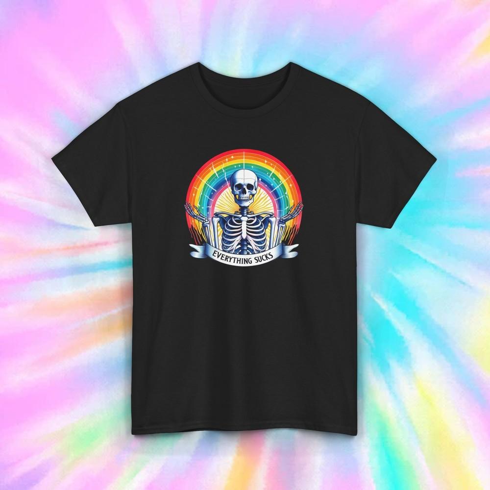 Everything Sucks Funny Skeleton Rainbow Sarcastic Humor T-Shirt Tee S-5XL