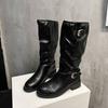 British Style 2025 Autumn New Belt Buckle Splicing Western Cowboy Boots Round Head Thick Heel Sleeve Versatile Knight Boots