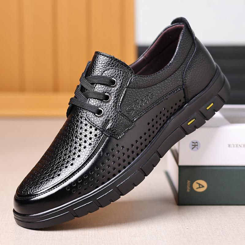 Hollow Leather Shoes Hollow Sandals Punched Round Head Men's Shoes Black Non-slip Breathable Deodorant Spring and Summer Casual Middle-aged Dad