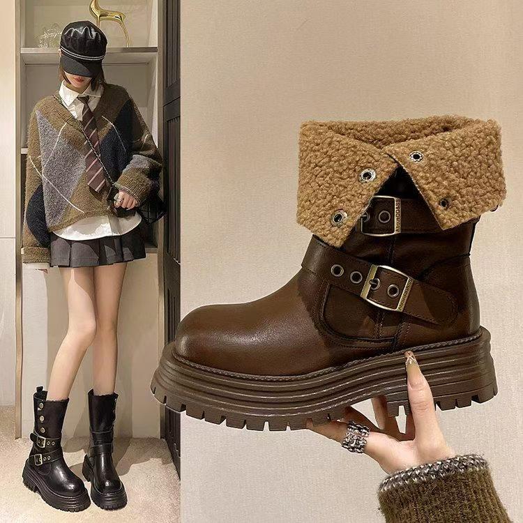 British Style Thickened Martin Boots Women's 2025 New Winter Cotton Boots Retro Two-wear Medium Boots Thick-soled Velvet Short Boots