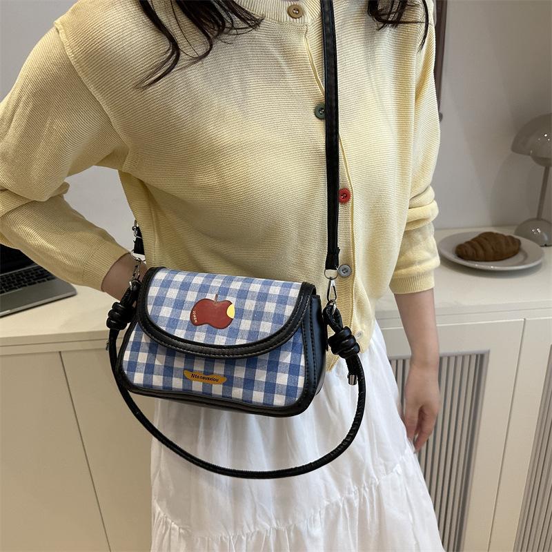 Korean Version Plaid Mini Shoulder 2025 Contrasting Color Embroidery Chain Messenger Bag Sweet and Cute Portable Fashion Saddle Bag