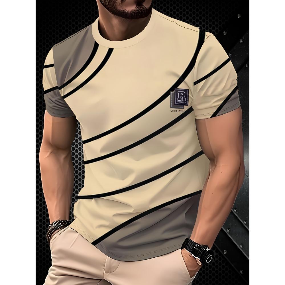 Men's 3D Digital Printed Striped T-shirt, Breathable Short Sleeved Round Neck Casual Sportswear, Daily Business Top