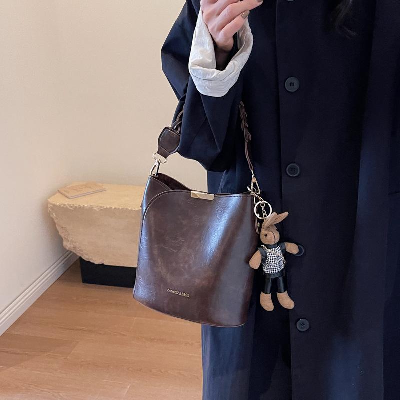 Bucket Bag Women's Oblique Span Small Satchel Niche Retro Commuter Shoulder Bag Large Capacity Simple Handbag Small Bag