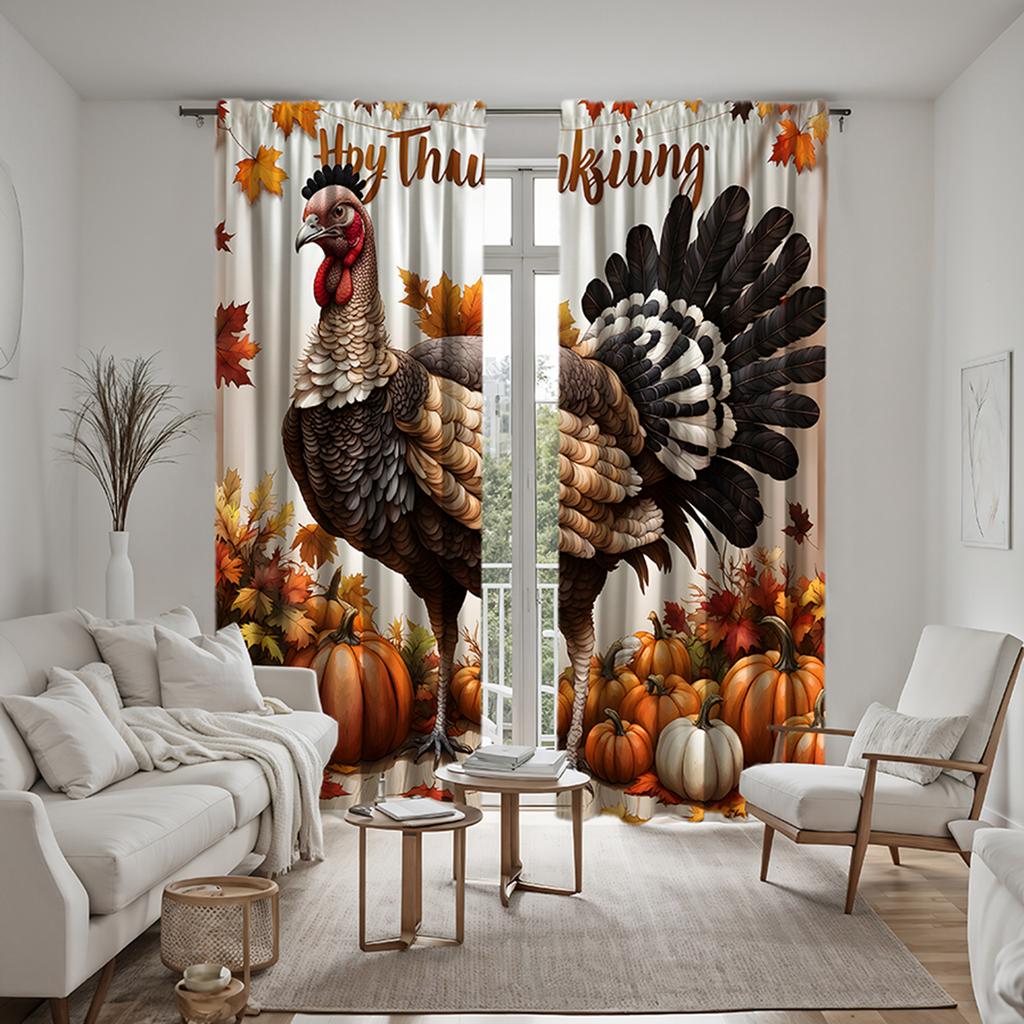 2pcs Set HD Thanksgiving Turkey Pumpkin Maple Leaf Decorative Curtain Yellow Tie Digital Printed Curtain Home Decor Styl