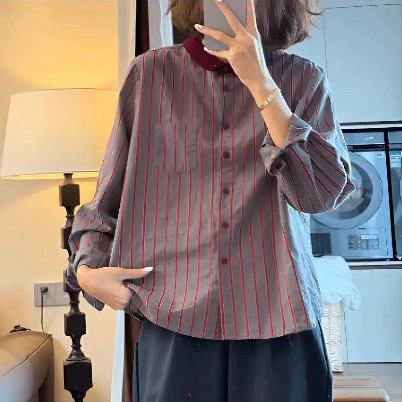 Contrast Striped Lapel Spliced Shirt Autumn New Fashion Retro Evergrande Long Sleeve Women's