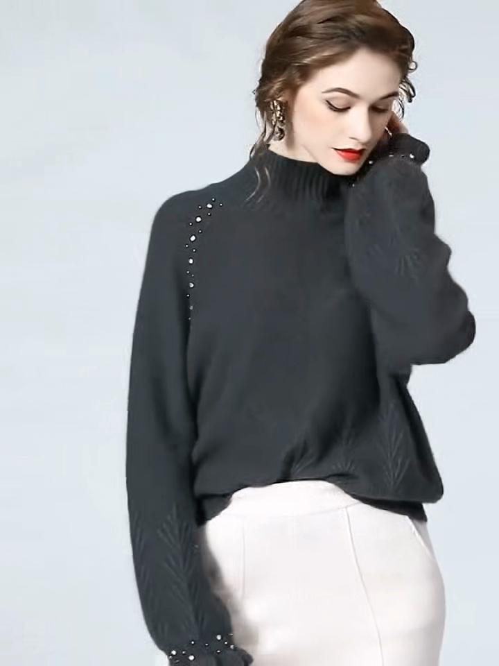 Women's Turtleneck Sweater Autumn Winter Beaded Loose Sweater Solid Color Pullover Knit Top