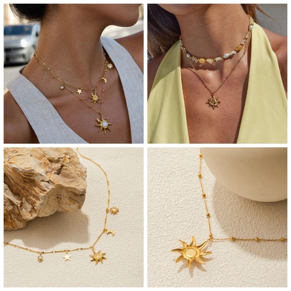 Stainless Steel 18K Gold Plated Necklace Layered Chain Double Stacked Neck Chain Sun Pendant Beach
