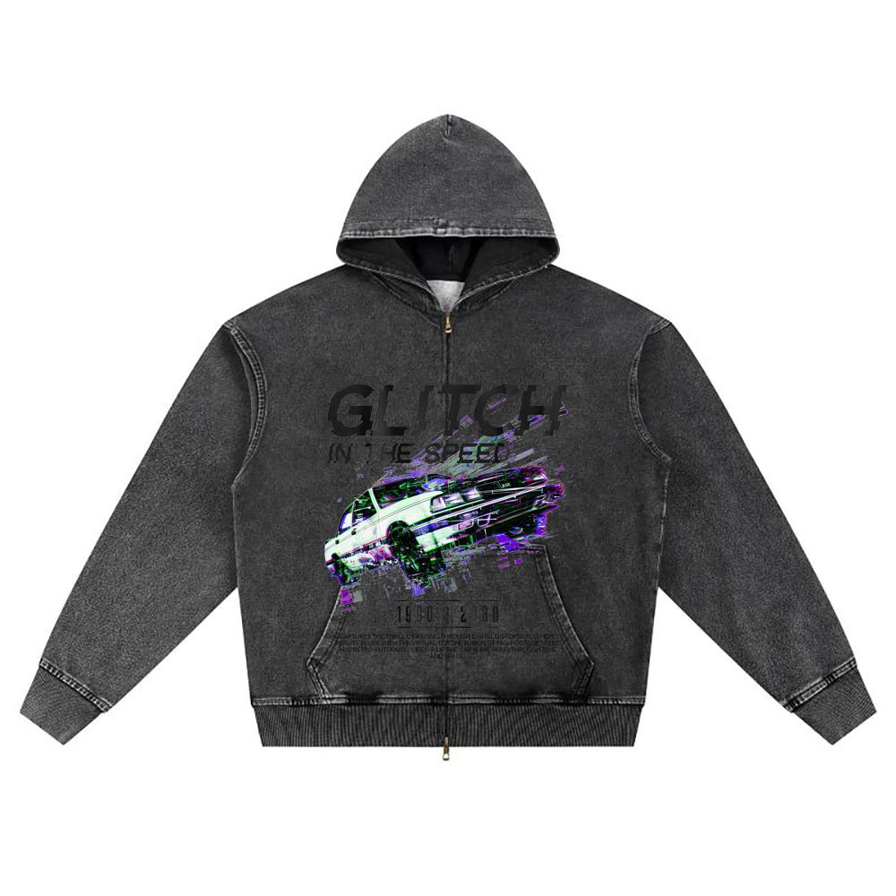 DTG Print Knitted Denim Zip-Up Hoodie Glitch In the Speed Brother Print Zipper Hoodies